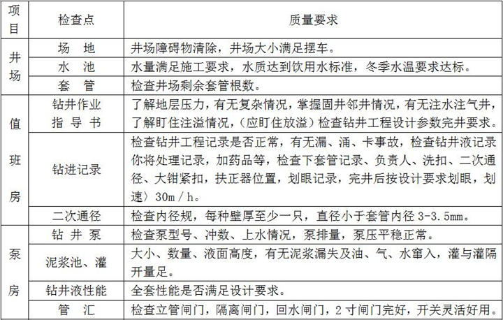 2、固井施工:按設(shè)計注入隔離液,水泥漿壓膠塞,頂替鉆井液、碰壓、試壓完成、固井施工過程檢查點項及要求如下: